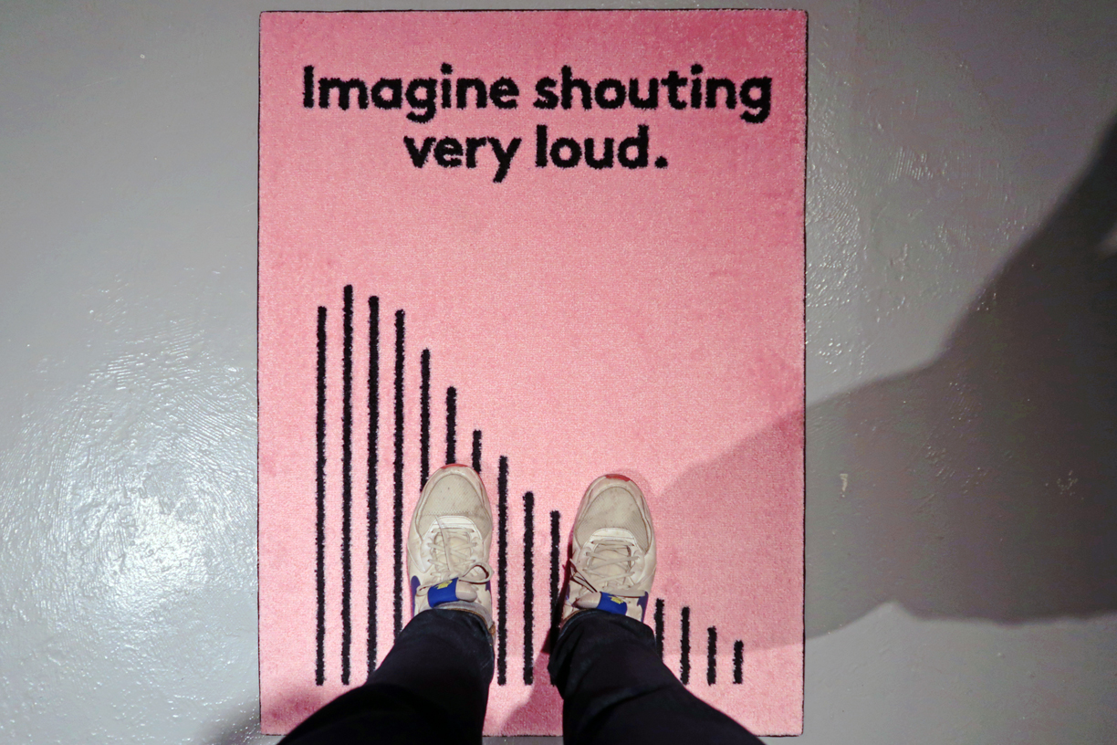 Imaginez qu’il n’y ait pas de toit invite les visiteurs à de brèves méditations sonores en se tenant debout sur les tapis.