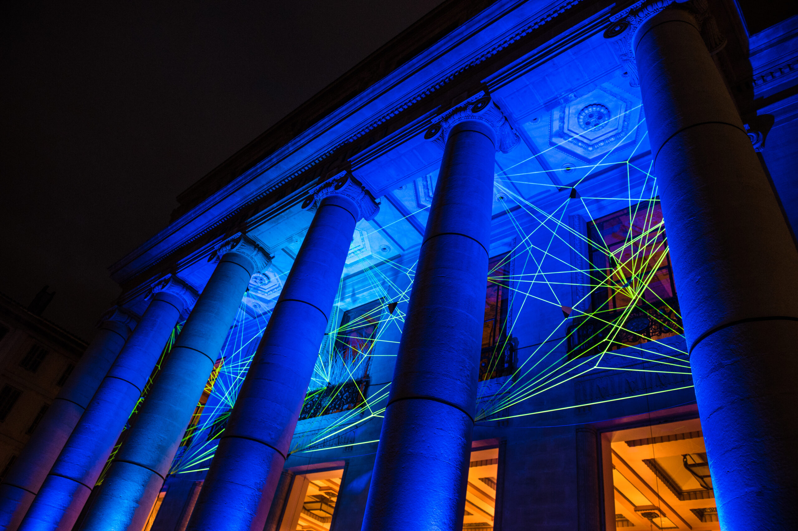 A Marseille, Tom&Lien Dekyvere déploie sur la façade de l’Opéra, Lumiphone, nouvelle forme de cette installation lumineuse qui renvoie au mégaphone, au porte voix du crieur public. Composée en rhizomes lumineux, elle varie au gré du son capté sur la place.