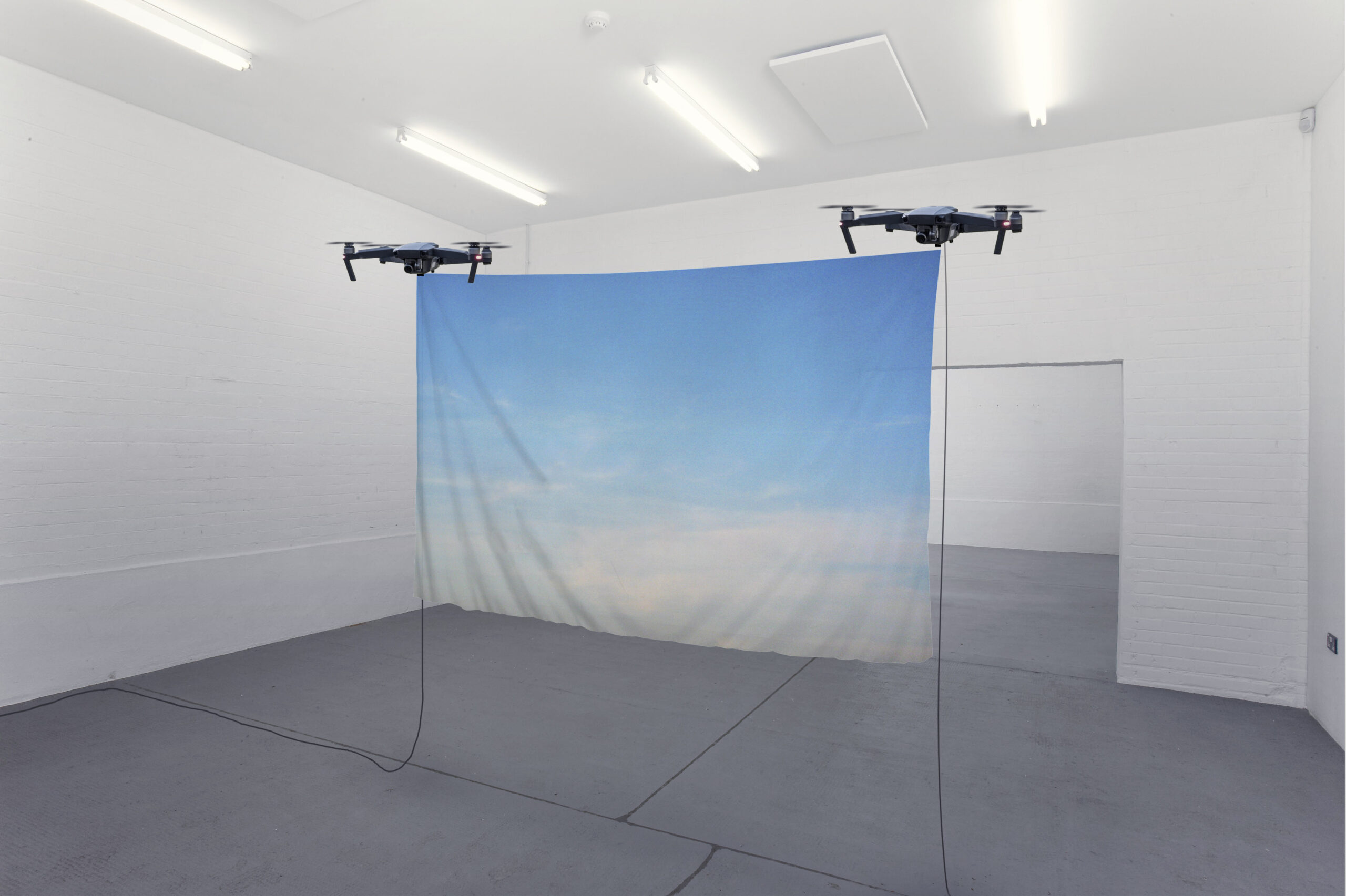 Par cette création, les artistes proposent une inversion absurde : les drones portent une portion de ciel alors qu’habituellement ils se déplacent à l’intérieur de celui-ci. Bien qu’ils soient le support d’accroche de cette représentation du ciel bleu, en aucun cas les drones ne perdent leur charge symbolique. Nous les associons à des outils de prévention ou engins de surveillance, ou encore des tueurs invisibles… Les drones inquiètent autant qu’ils fascinent.
