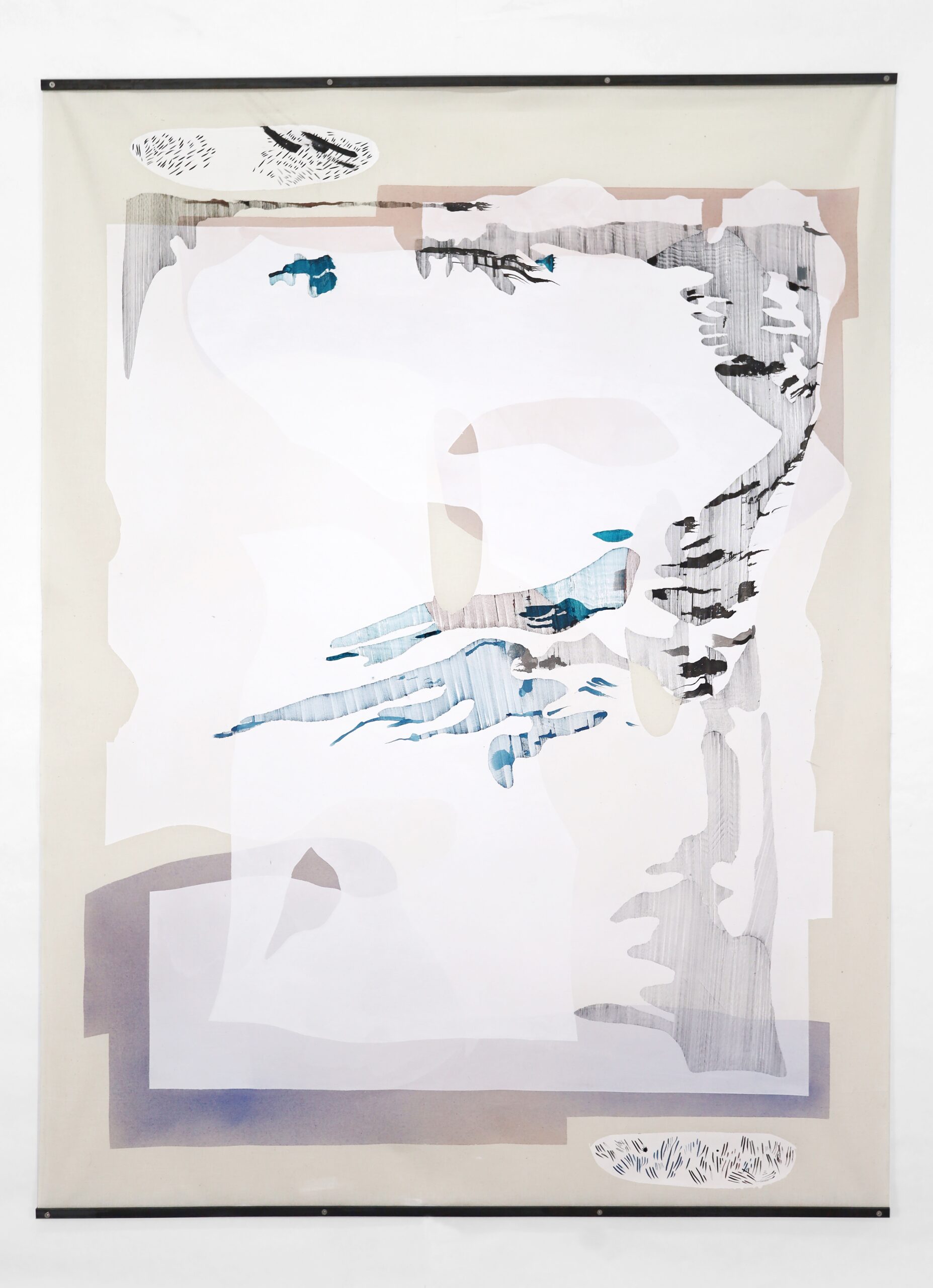 Dans cette œuvre, Bouvier trace les formes persistantes du mal et de la perte à l’encre pigmentée sur des voiles de gesso et de gouache sur une toile brute. Suspendues à des supports en acier, les toiles prennent une qualité translucide, permettant à de nouvelles ombres d’émerger sur leur face arrière, tandis que le long des bords, des panneaux de gesso ont été utilisés pour éponger l’excès d’encre de ses stylos.